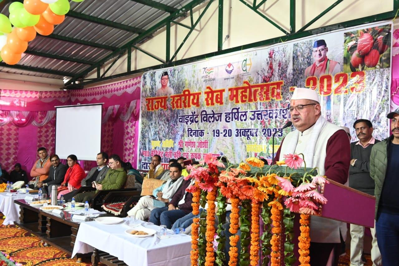 इस अवसर पर कृषि मंत्री गणेश जोशी ने वाईब्रेन्ट विलेज हर्षिल घाटी में उत्तराखण्ड के बहु प्रसिद्ध सेब उत्पादक क्षेत्र हर्षिल उत्तरकाशी में उद्यान विभाग द्वारा दो दिवसीय “राज्य स्तरीय सेब महोत्सव – 2023” के  आयोजन पर प्रसन्नता व्यक्त की। कृषि मंत्री गणेश जोशी ने कहा इस महोत्सव में राज्य में उत्पादित विभिन्न प्रकार की सेब प्रजातियों का संकलन देखने को मिलेगा। साथ ही सेब उत्पादन की विभिन्न तकनीकों का सजीव प्रदर्शन, विभिन्न कम्पनियों/संस्थानो (पौधशाला प्रबन्धन, सूक्ष्म सिंचाई प्रणाली, औद्यानिक यन्त्रीकरण, तुड़ाई उपरान्त प्रबन्धन, पैकेजिंग, विपणन एवं प्रसंस्करण) एवं विभिन्न सेब उत्पादकों द्वारा भौतिक रूप से प्रतिभाग किया गया है। इस प्रकार के आयोजन से राज्य में सेब के उत्पादन को व्यवसायिकता के आधार पर उच्च स्तर तक ले जाया जा सकता है। उन्होंने कहा देश में कुल 3.05 लाख है0 में 26.60 लाख मै0टन सेब का उत्पादन किया जा रहा है, जिसमें उत्तराखण्ड में 0.65 लाख मै0टन सेब का उत्पादन किया जा रहा है, जिसमें सर्वाधिक उत्पादन जनपद उत्तरकाशी में लगभग 45 प्रतिशत (29018 मै0टन) है। उत्तराखण्ड के समस्त पर्वतीय जनपदों में सेब का उत्पादन किया जा रहा है, जिसमें मुख्य रूप से जनपद उत्तरकाशी, देहरादून, अल्मोडा, नैनीताल, एवं चमोली सम्मिलित हैं। उन्होंने कहा वर्ष 2020-21 के आकडो के अनुसार में राज्य में उत्पादित सेब की उत्पादकता मात्र 2.50 मै0टन/ है० है। आवश्यक है कि उच्च गुणवत्तायुक्त पौध रोपण सामग्री के माध्यम से नये बागानो की स्थापना की जाए तथा पुराने अनुत्पादक बागों का जीर्णोद्वार कर उत्पादकता में वृद्वि की जाय।
